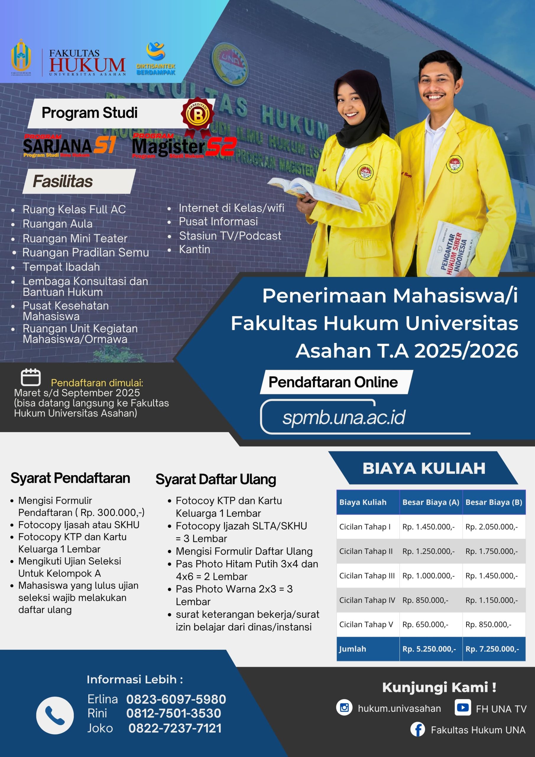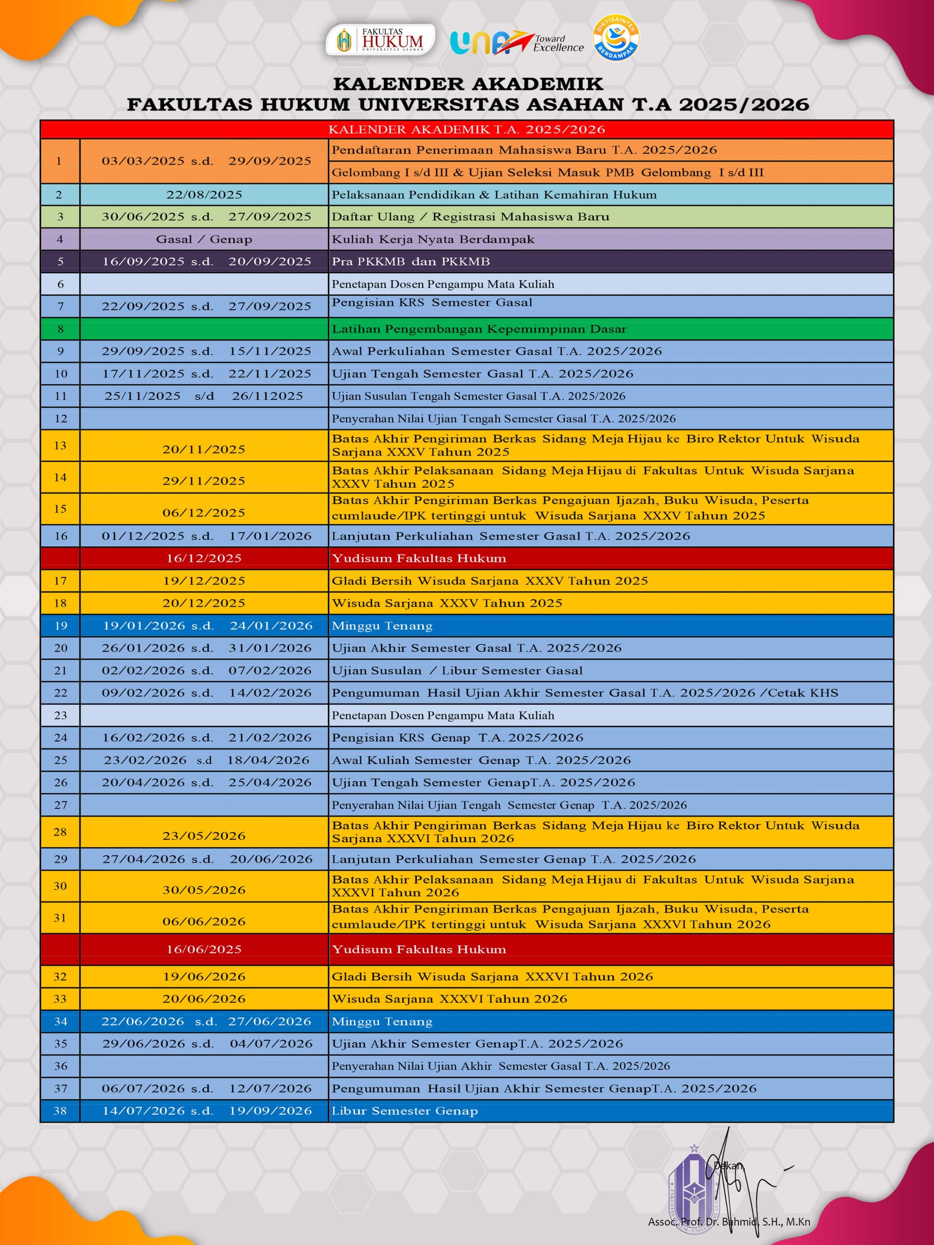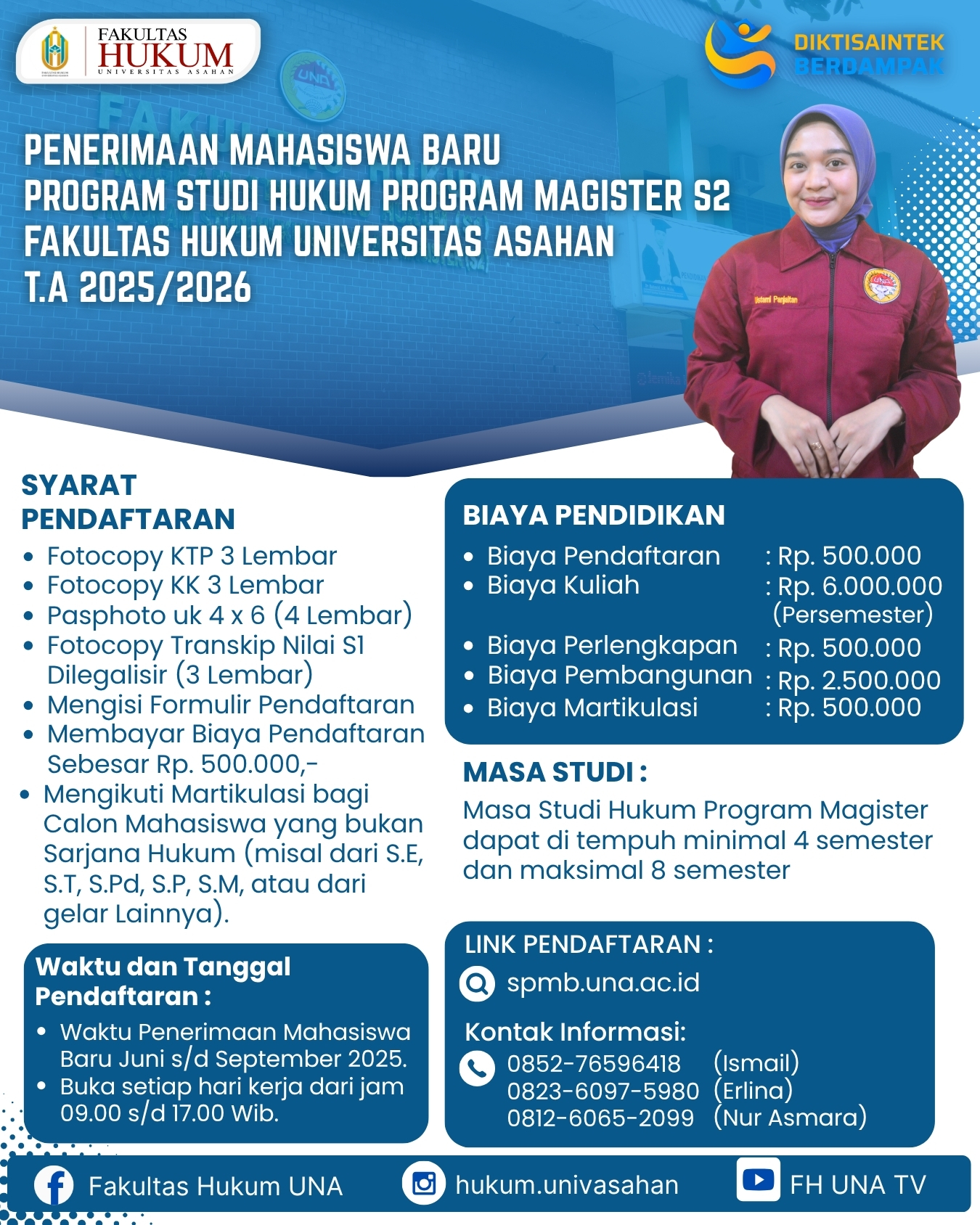 KEGIATAN AKADEMIK Bahas Pencegahan Perdagangan Orang dan Terorisme, Fakultas Hukum Universitas Asahan Hadirkan Empat Pakar Hukum 11-07-25 | Akademik Otto Hasibuan Hadiri Seminar Nasional di UNA, Bahas Peran Paralegal dalam Penyelesaian Konflik 11-07-25 | Akademik Universitas Asahan Gelar Sosialisasi SAPTO 2.0: Dorong Efisiensi Sistem Akreditasi Perguruan Tinggi 11-07-25 | Akademik Fakultas Hukum Universitas Asahan Gelar Kuliah Umum: Tekankan Pentingnya Partisipasi Publik dalam Legislasi 11-07-25 | Akademik Telah dibaca: 299